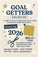 Goal Getters: Kids Edition is a fun, creative New Year workshop designed to help young dreamers imagine big, dream boldly, and step into 2026 with confidence. Kids will explore their interests, set age-appropriate goals, and build their own personalized vision boards to take home and enjoy all year long.